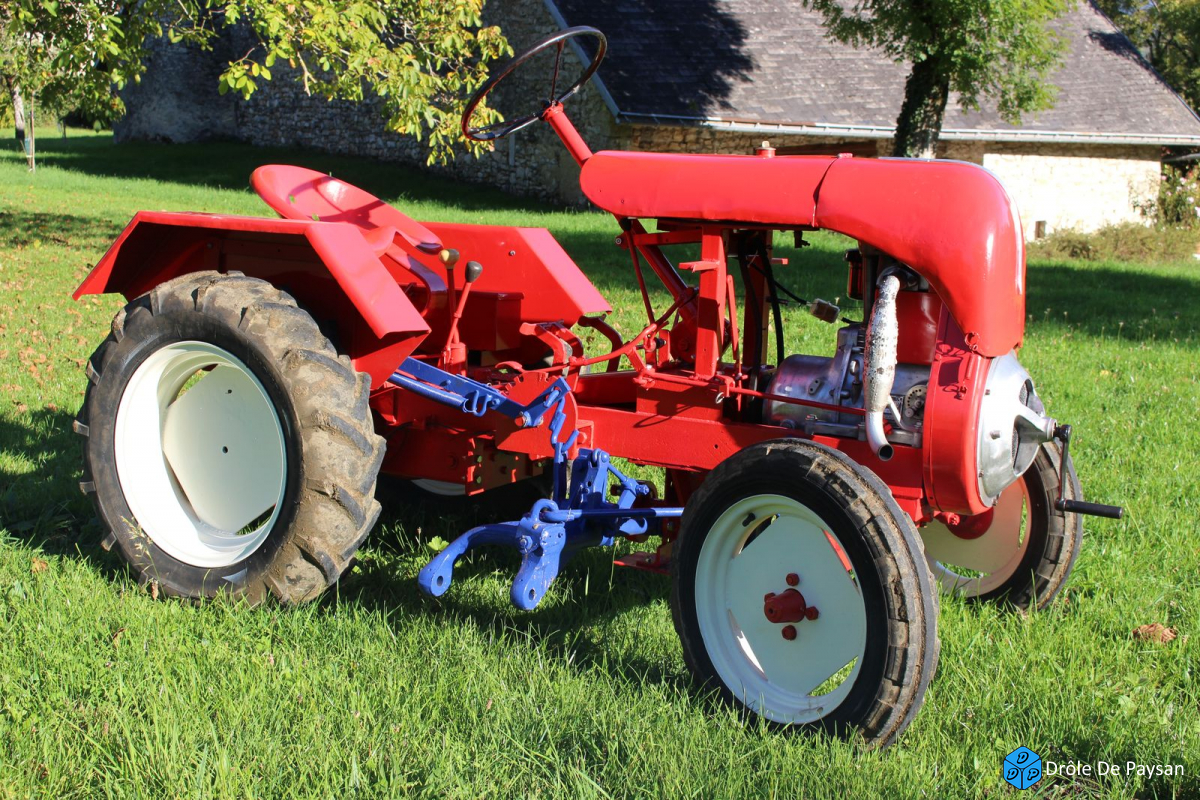 Henri Putigny était installé à Saint-Usuge en Saône et Loire. Il a construit dans les années 50 une centaine de tracteurs. La plupart étaient montés avec des ponts à vis Ford et sans prise de force. Ils étaient motorisés avec des Bernard W112 ou 112 Bis ( 8 ou 10 cv). Celui que j'ai sauvegardé est de 1958 et porte le n°21. Il est motorisé avec un Bernard W112. Son pont est un Babiole à engrenage latéral et il a prise de force et blocage du différentiel. La voie des tambours de freins est très étroite et ils sont d'un diamètre important par rapport au poids du tracteur ce qui explique les entretoises entre les roues et les tambours.